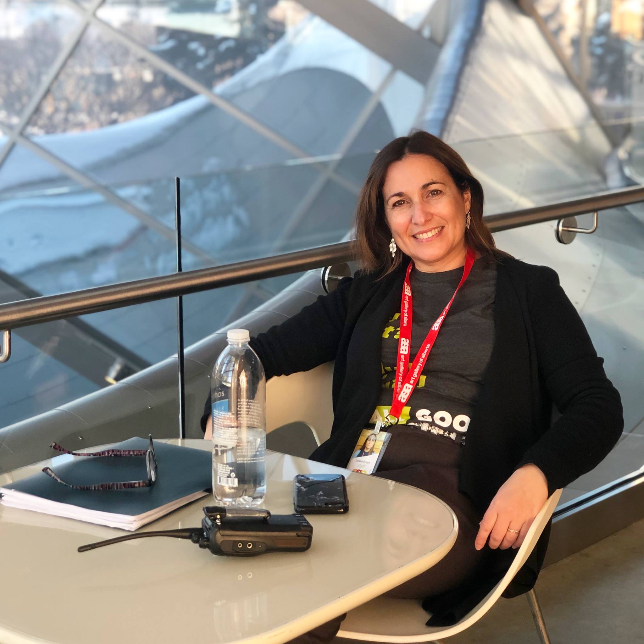 When asked about her story she states "Like the clients you serve and some of the people who work here, I was once a newcomer, speaking mostly Spanish since I was born in Argentina. As years went by I completed my undergraduate and graduate education (BA and MA Art History) at the University of Alberta, raised two children, Federico and Bianca who are now university graduates themselves, and began work as a Gallery Assistant at the Art Gallery of Alberta. I also began to write poetry mixing English and Spanish and became acquainted with the Edmonton arts community through my participation in the Borderlines Writers' Group at the Writers Guild of Alberta and as a performer and event organizer at the Edmonton Poetry Festival. What I want to say is that, far from forgetting about my mother tongue, these days it is more present than ever, when I realize that what makes Edmonton a vibrant city is this Babel, this variety of languages heard throughout every place in the city. During my time here I want to allow the community around A4HC to express themselves in their mother tongue, and in English simultaneously, by engaging with the images that surround us, our Art Gallery, our downtown, our public art, writing about those experiences of looking around, grounding themselves in this new place, in whatever language they decide they wish to write."